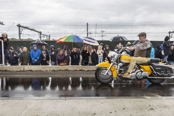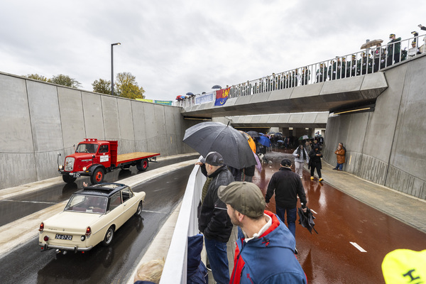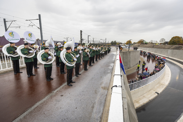 Uiteindelijk kon de feestelijke opening zonder problemen plaatsvinden. Eerst werden ruim honderd genodigden - waaronder bestuurders, projectpartners, aannemers, buurtvertegenwoordigers - ontvangen in een feesttent met koffie en petit fours met het logo van Vierpaardjes. Na de symbolische opening van de slagbomen volgde het publieke moment: de stoet van vijftig bijzondere voertuigen - van Dafjes tot oude brandweerwagens, ambulances en politiewagens - die langs de route trok en een aantal maal via de spoorwegonderdoorgang reed. Twee mensen gekleed als bouwvakker met oranje hesje en helm reden met kruiwagens met frisdrank rond en deelden dit uit aan het publiek. "Het regende flink, dus we waren benieuwd hoe druk het zou worden. In plaats van enkel geïnteresseerden uit de wijk, kwamen er duizend mensen uit de stad naar de stoet kijken. Vanwege de regen had ik bewust een tent met zijwanden en een houten vloer geregeld, zeker omdat je op een bouwplaats met modder en zand staat. De hoogwaardigheidsbekleders hebben we allemaal met paraplu's ontvangen vanuit de auto."